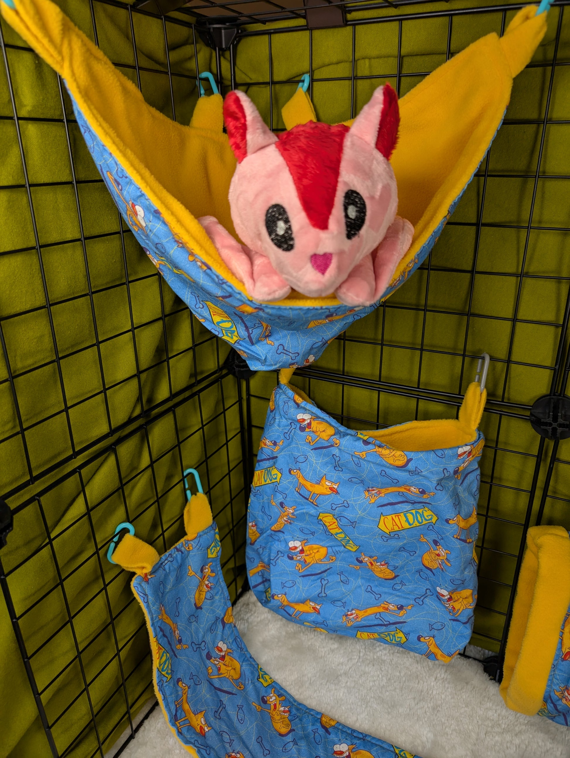 Each piece is handmade with care, using durable materials and reinforced stitching to ensure long-lasting use. Whether you’re decorating a sugar glider cage or creating a vibrant setup for other small mammals, this CatDog cage set adds a playful pop of personality while keeping your pets happy and secure.