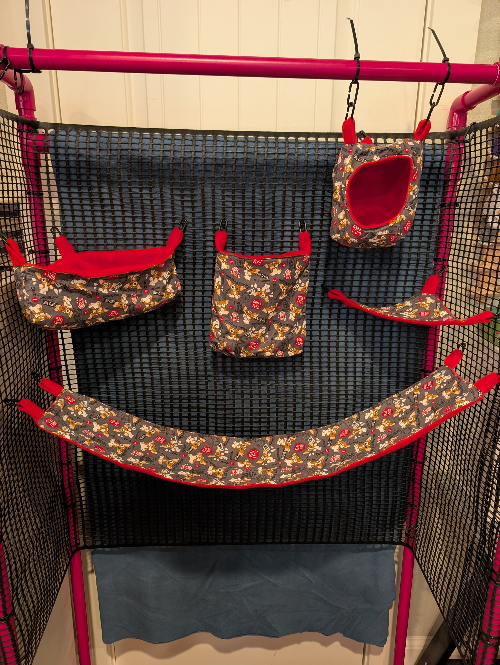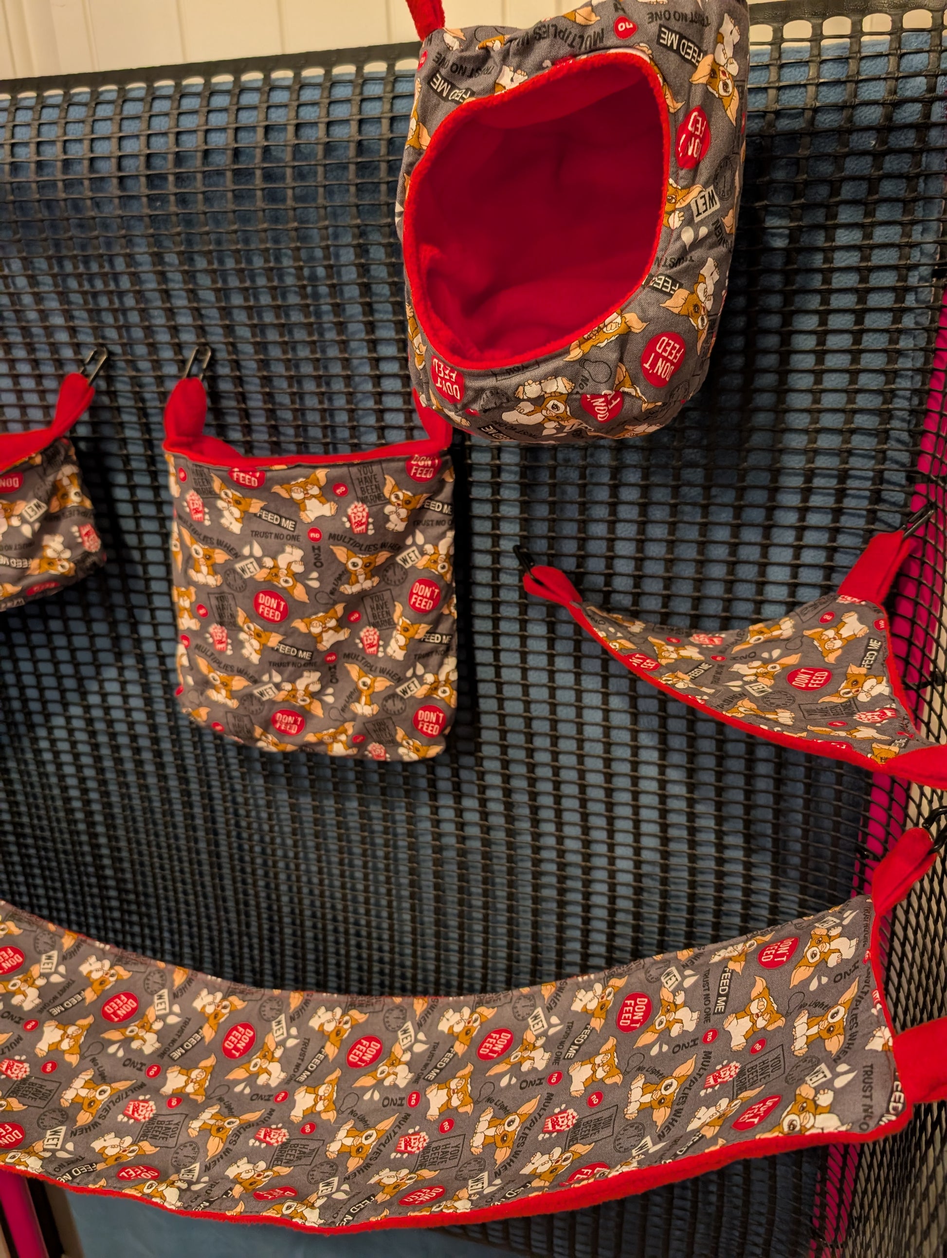 All pieces are sugar glider safe, featuring hidden seams to prevent snagging and ensure long-lasting durability. This set also works great for hamsters, rats, ferrets, hedgehogs, and other small mammals who love to climb, hide, and cuddle.