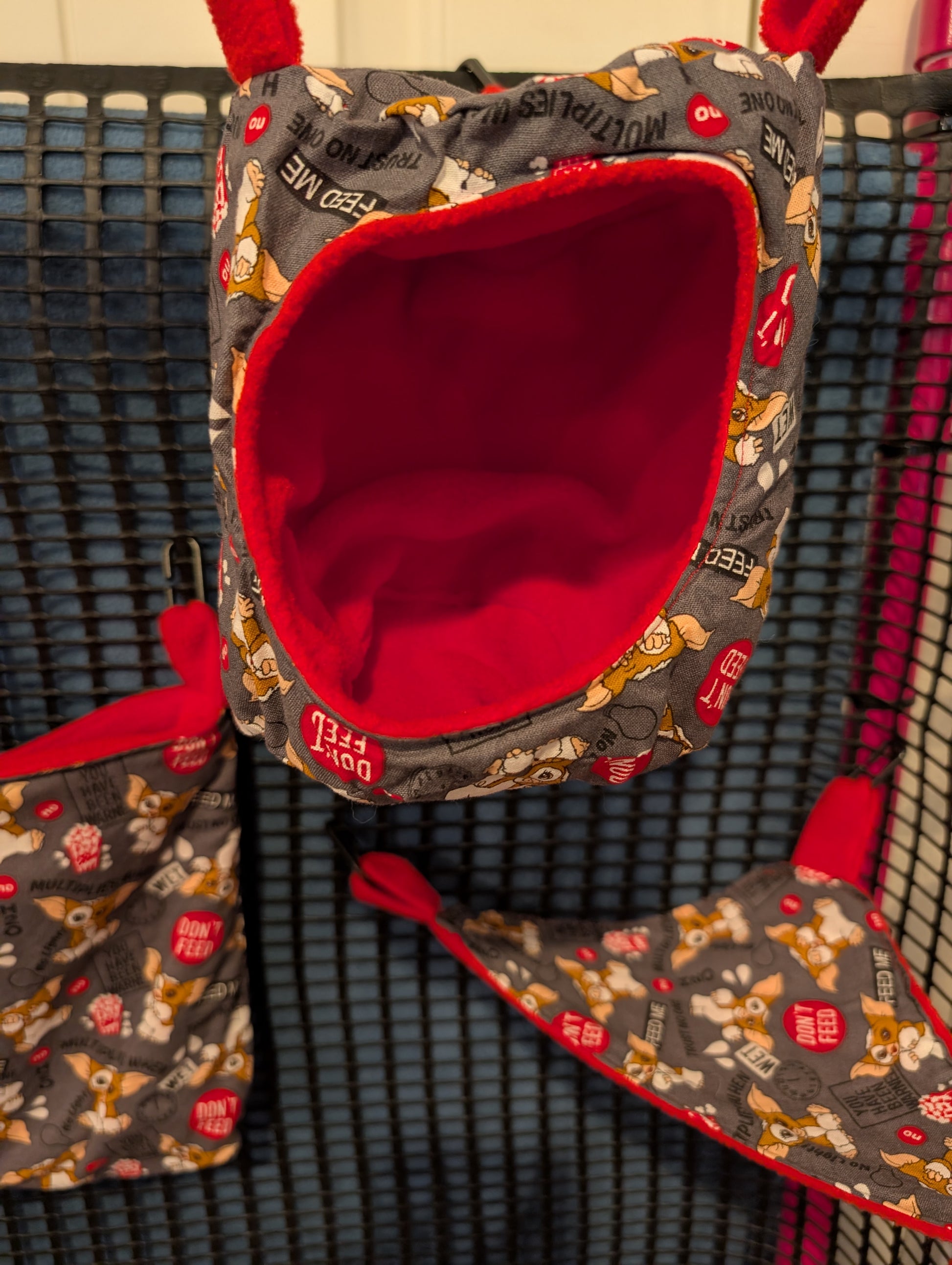 Bring a bit of mischievous movie magic to your pet’s home with our Gremlins Movie 5-Piece Cage Set! This themed set features officially licensed Gremlins character cotton fabric paired with color-matching red fleece, creating a cozy, fun, and nostalgic look for your pet’s enclosure.