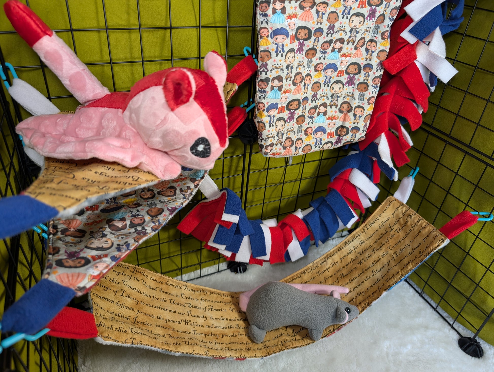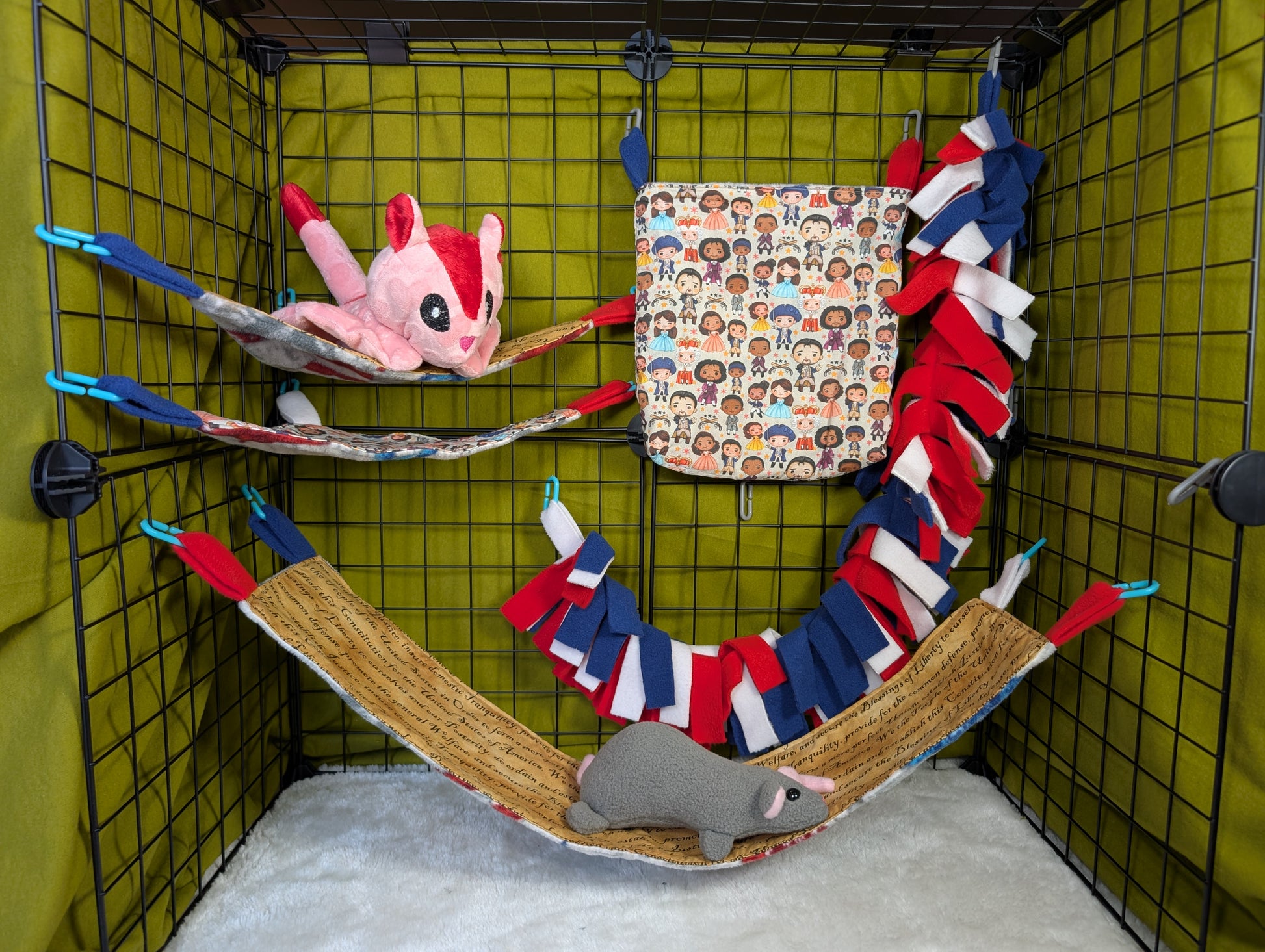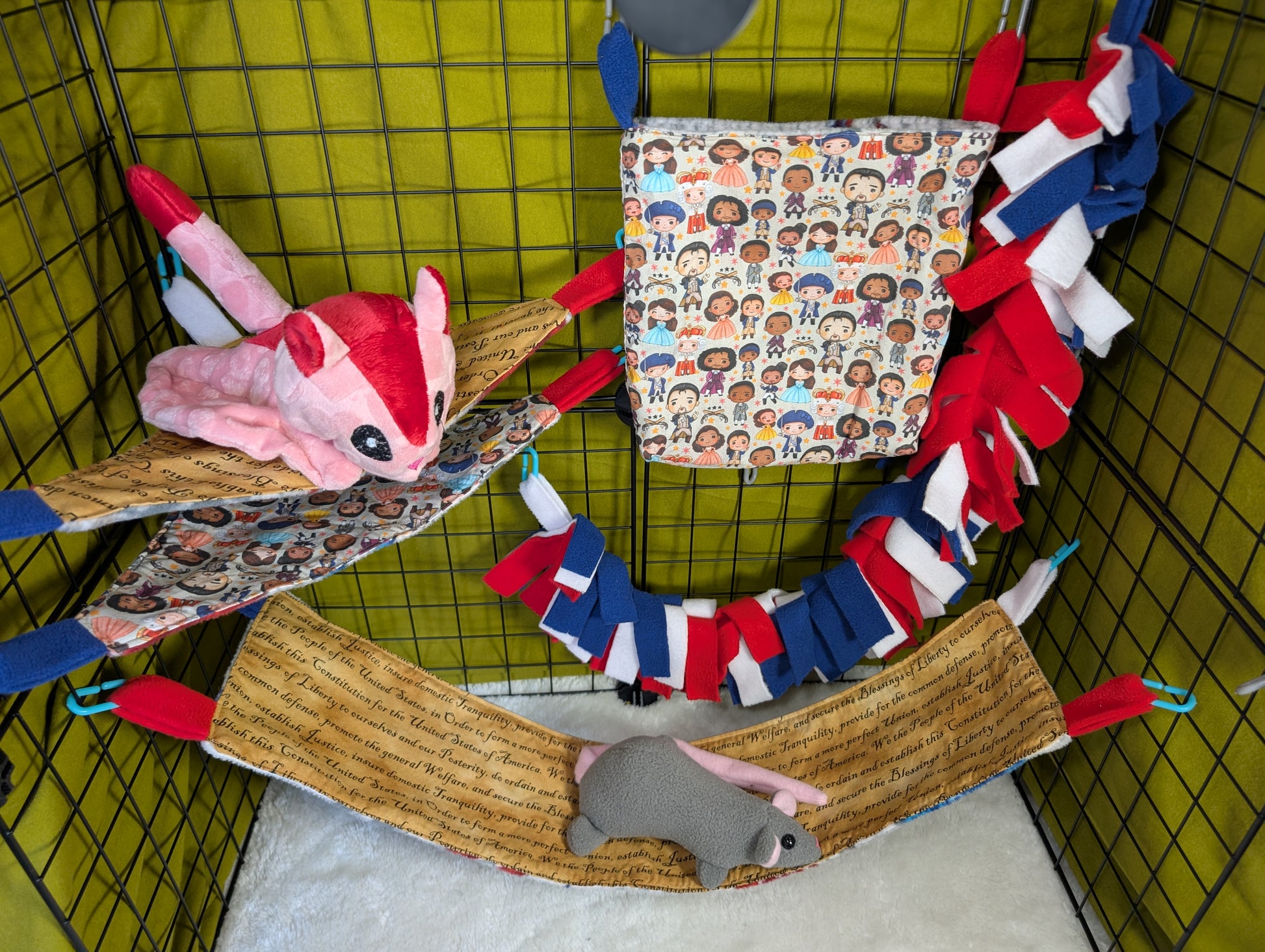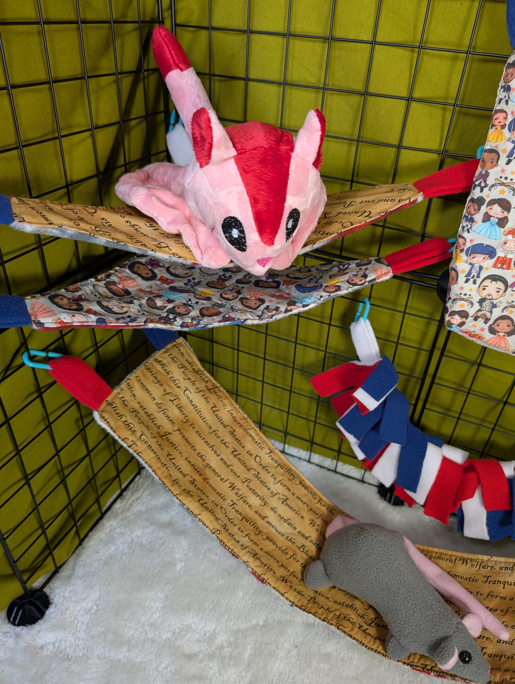 Step into the room where it happens with our Hamilton Musical 5-Piece Cage Set, designed for fans of the revolutionary Broadway hit and their small furry companions! This one-of-a-kind cage set blends comfort, style, and safety—perfect for sugar gliders, or other small pets who deserve a touch of theater in their habitat.