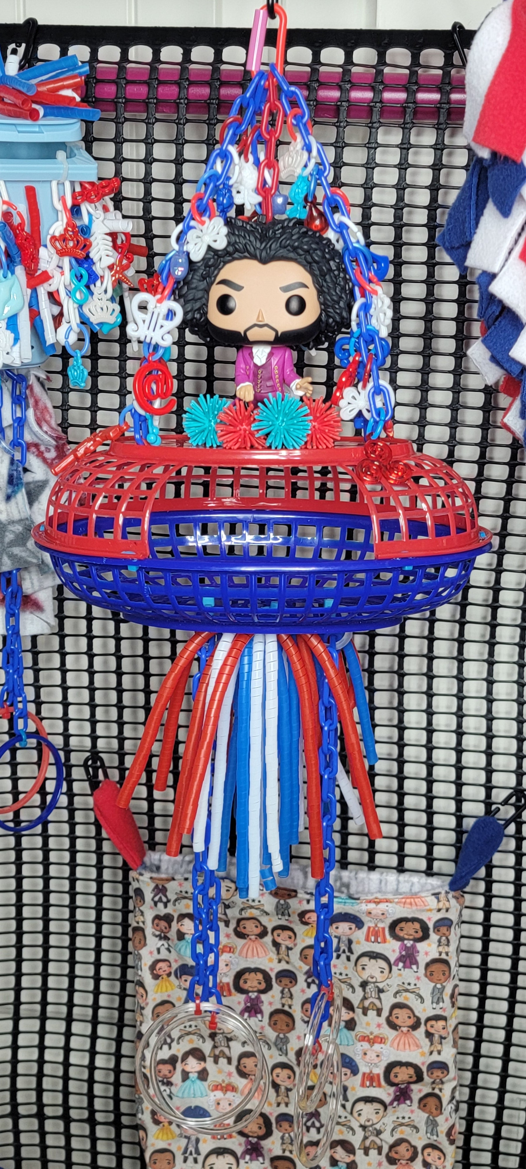 The themed toys include a decked-out trash can in matching colors, a Thomas Jefferson Funko Pop! double basket toy with pulleys, and an Alexander Hamilton Glider Mobile with pulleys, charms, and foraging baskets.