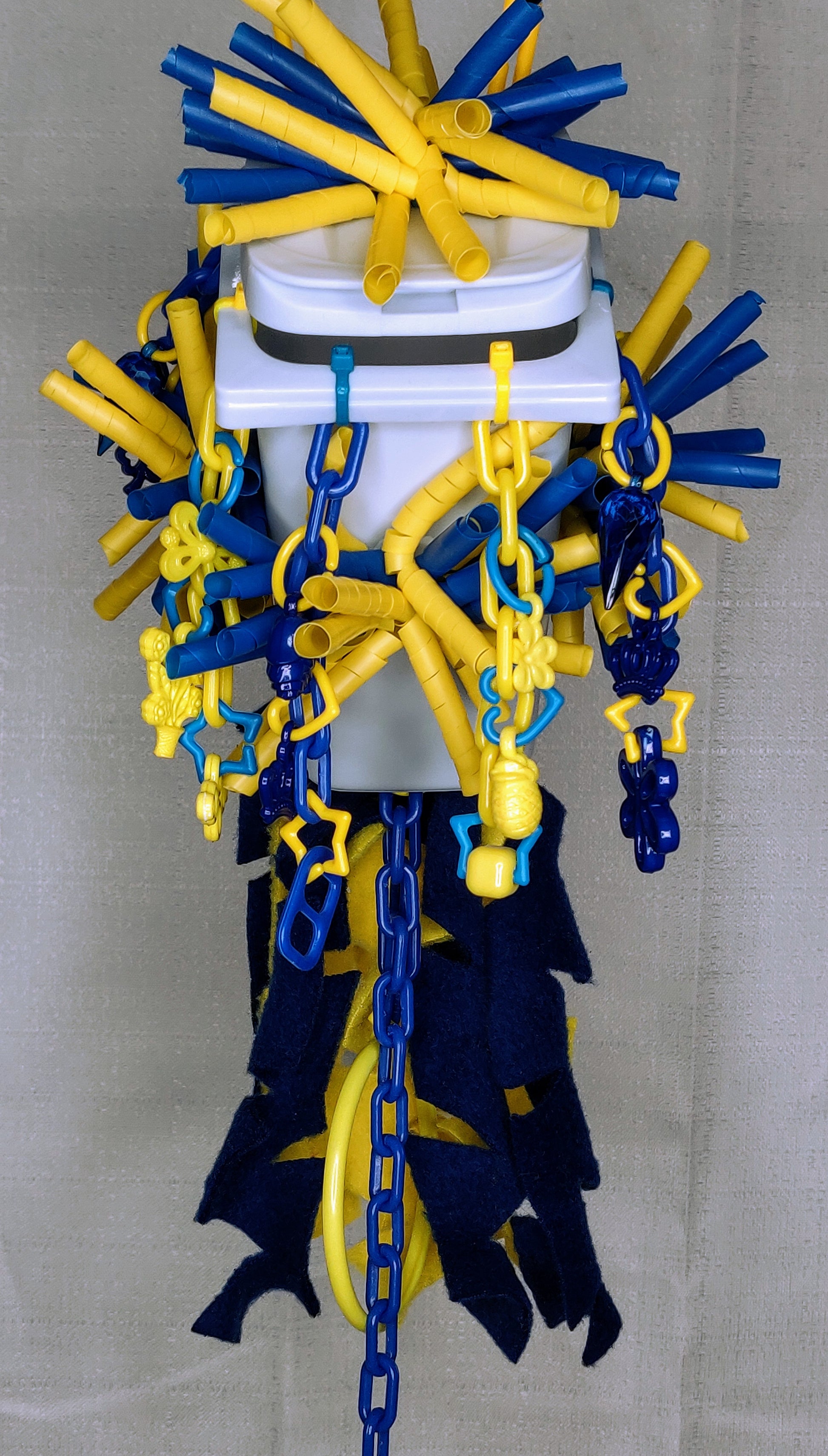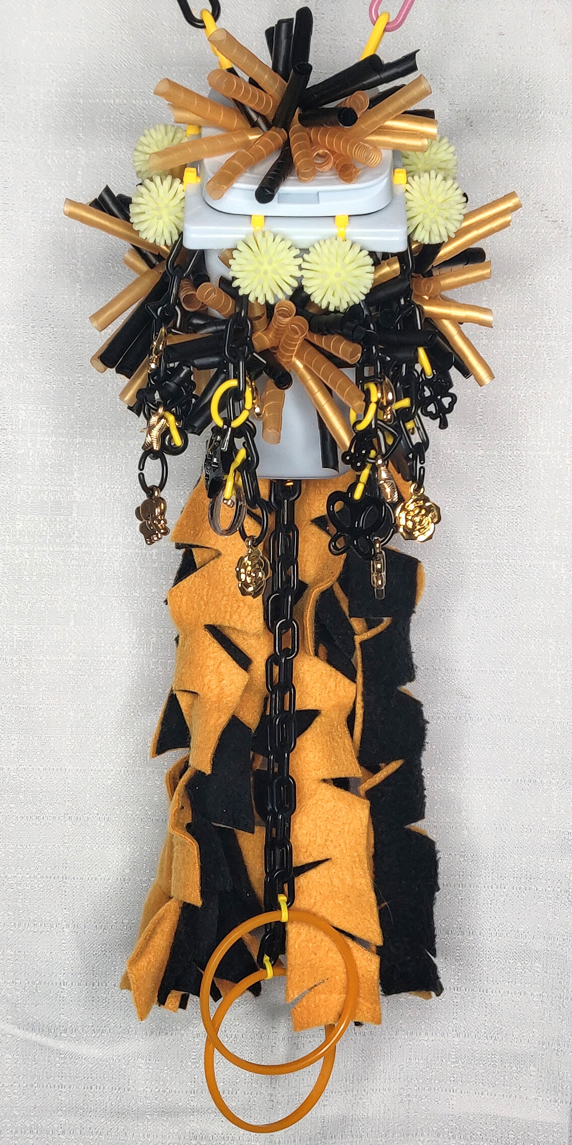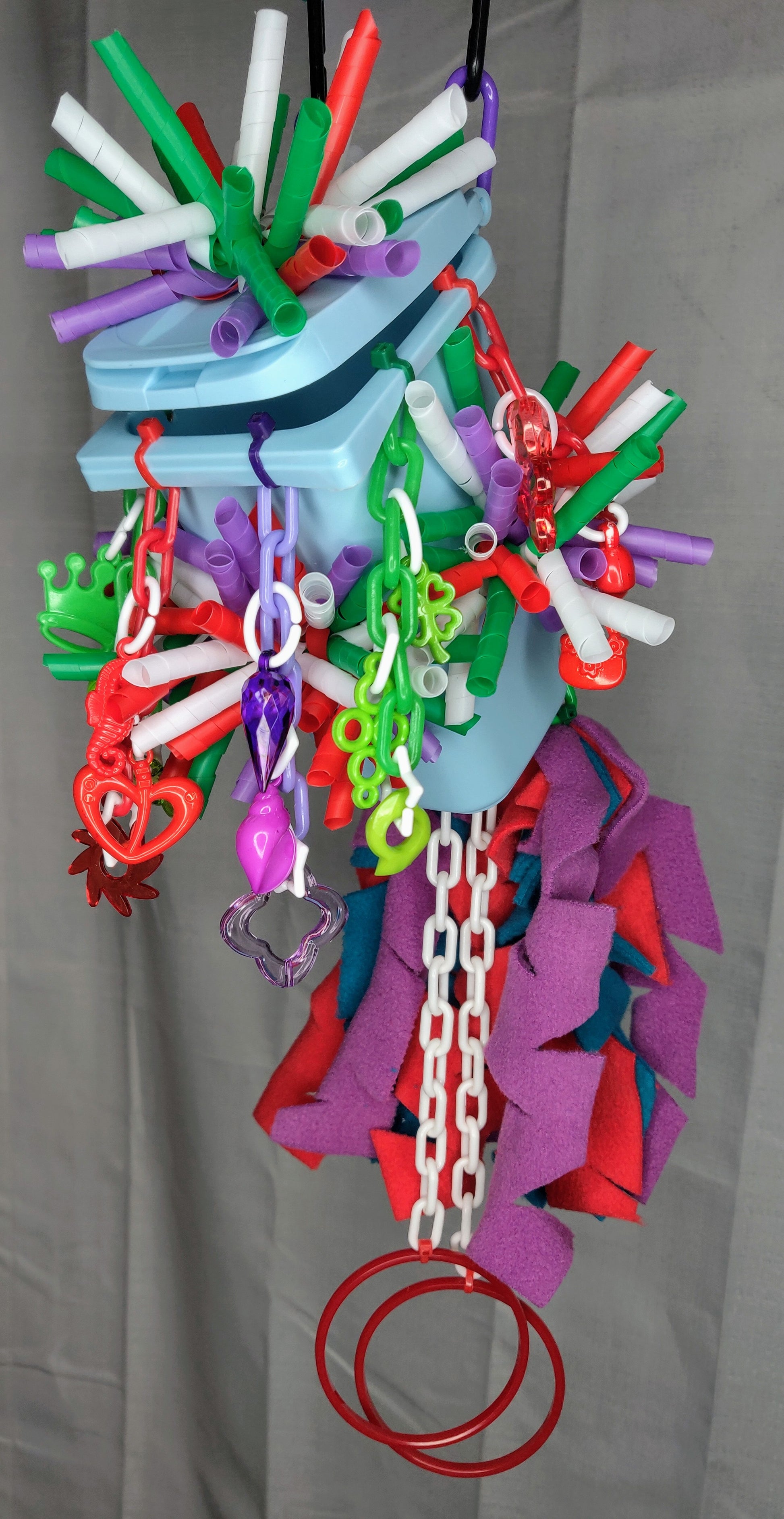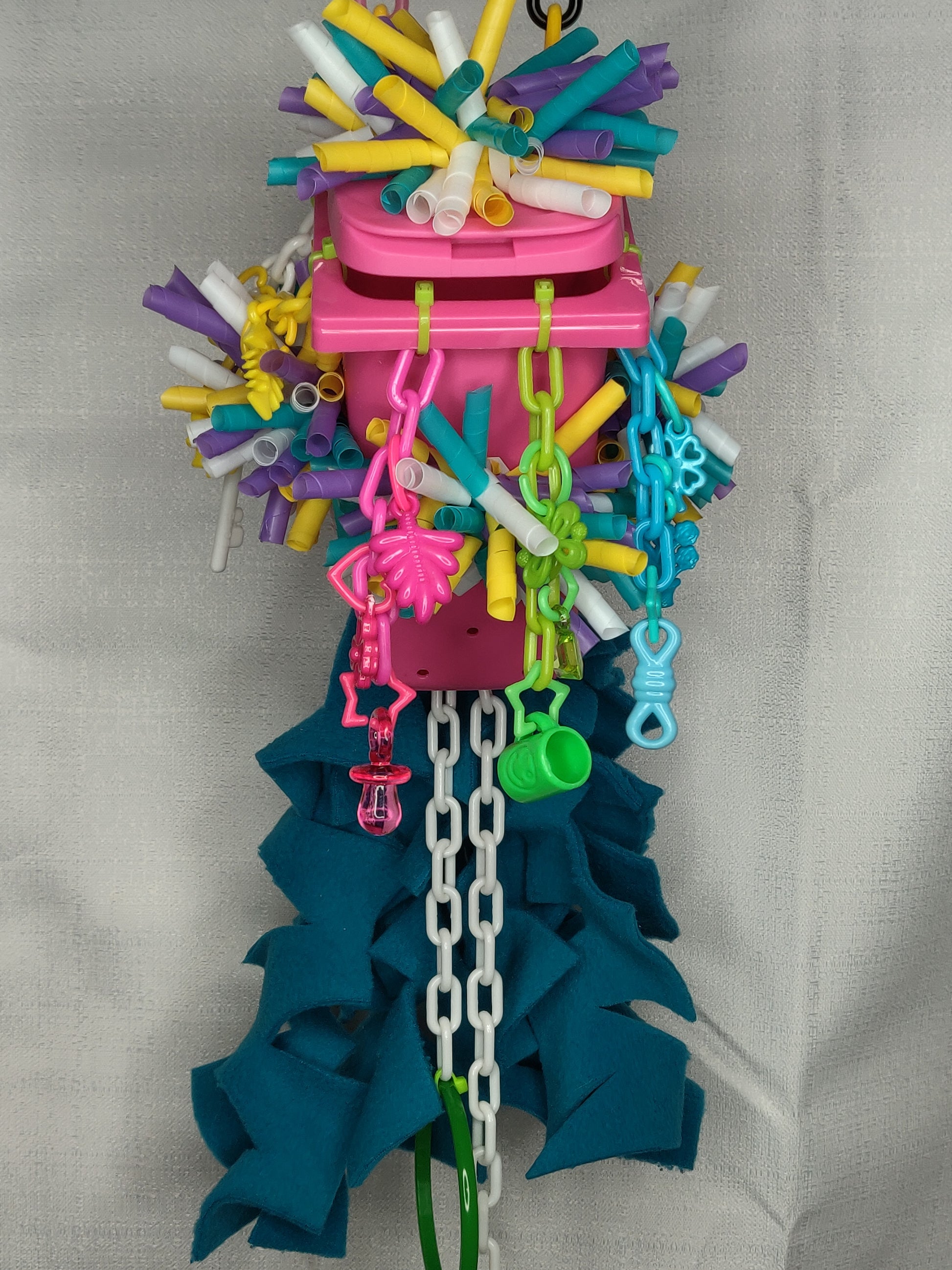 Let your pets explore and play in their own little mini trash can hideaway toy! This special will include the trash can base, twirled straws, a pulley, charms, chain, and fleece cascades to keep them entertained. Colors will be chosen at random.